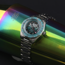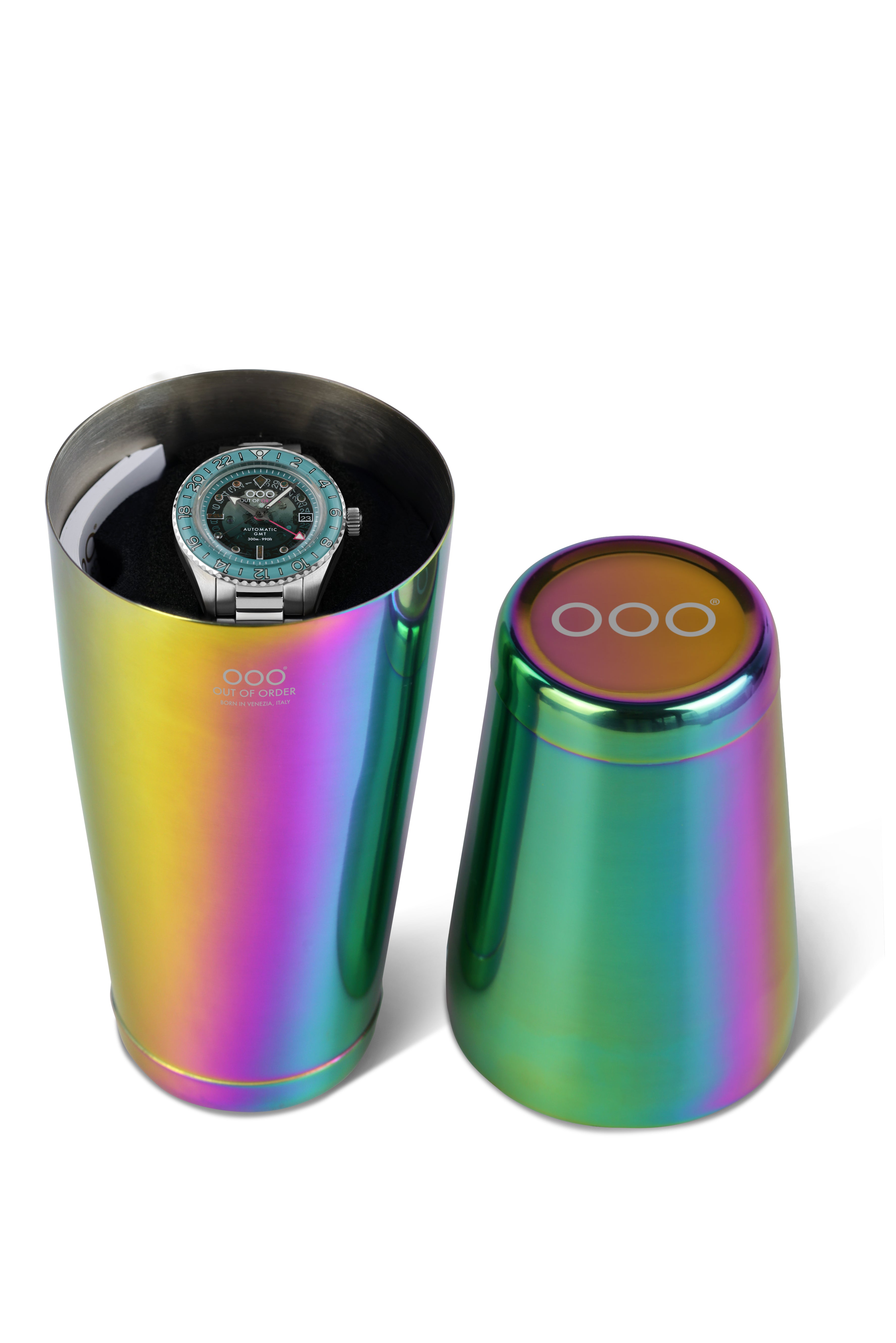 La colorazione di questo modello e ancora di più il riferimento sul fondello sono un omaggio diretto al cocktail Blue Lagoon, volto a creare un collegamento autentico e perfettamente integrato con l’universo OOO e la sua linea Shaker Automatic GMT.