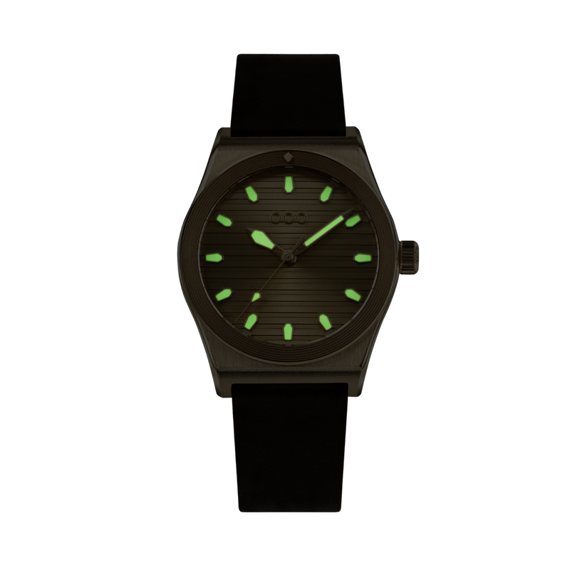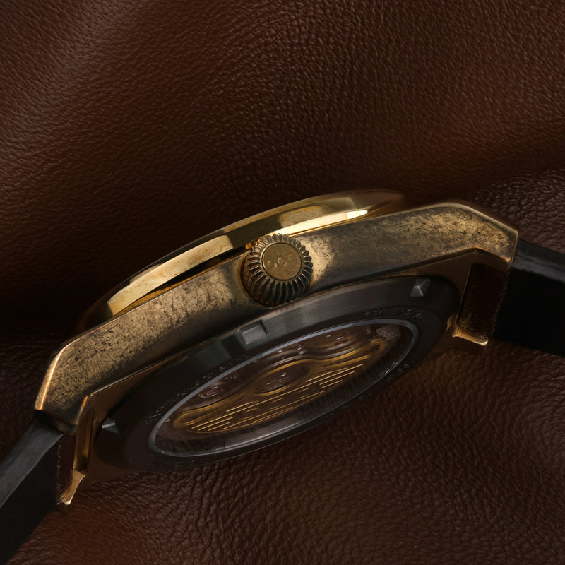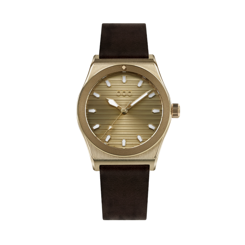 Il quadrante è completato dalla lunetta in bronzo marino lucido con inserto satinato a cerchi concentrici, e indice applicato a ore 12. Completano il modello il cristallo zaffiro, la corona a vite zigrinata con logo e il cinturino in pelle bovina italiana a concia vegetale, con fibbia in bronzo marino.