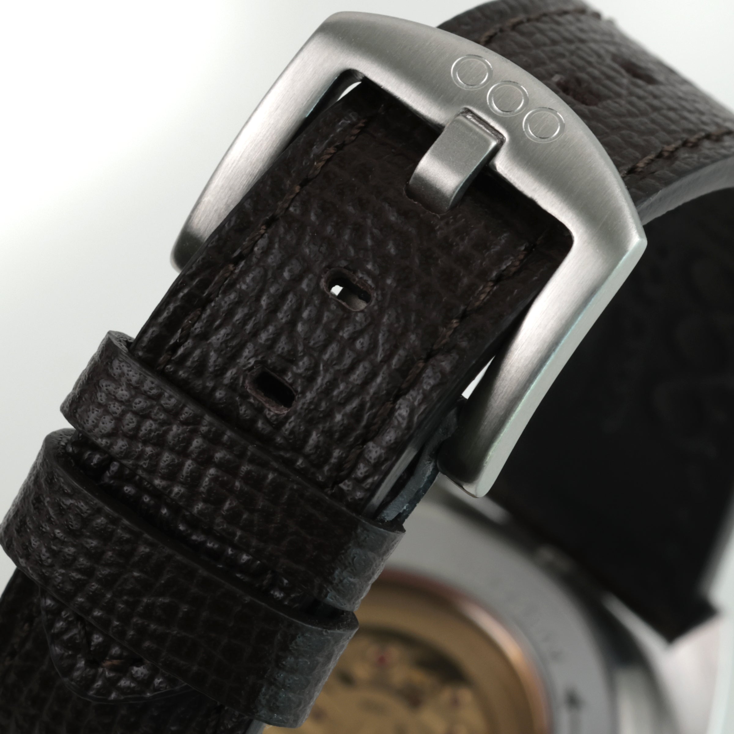 La cassa da 42 mm in acciaio inossidabile 316L ultra spazzolato trasmette solidità ed equilibrio, incorniciando un quadrante che si distingue per la sua sobrietà piuttosto che per l’eccesso.