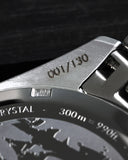 INDEXES & HANDS Applied indices with Superluminova® inserts, double printed logo and specifications in Superluminova®, Superluminova® printed date disk, IP silver hands with Superluminova® C3 (green) inserts