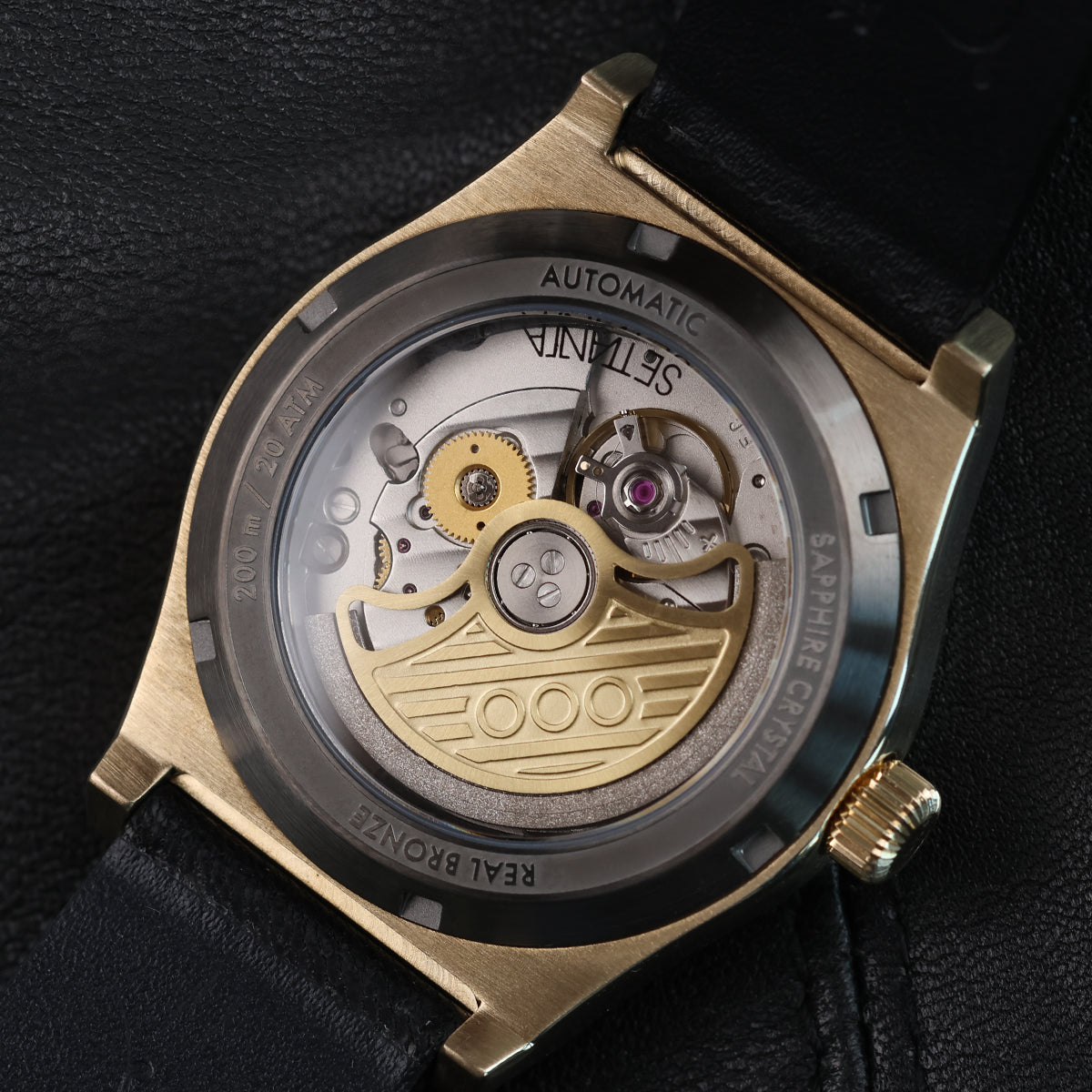 With water resistance up to 20 ATM (200 meters), SETTANTA combines precision and meticulous attention to detail. The 39 mm marine bronze case houses a Miyota 9039 automatic movement, elaboré according to OOO – Out of Order® specifications, featuring a custom rotor and dial, both crafted from marine bronze and enhanced with low-relief guilloché decoration.