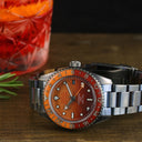 The case back is laser-engraved with a low tumbler surrounded by orange wedges, the glass used to serve this drink with its unmistakable dark orange color, which is beautifully reflected and shaded on the dial.