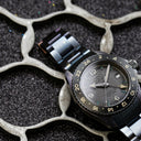 The matte sunburst and sandblasted black dial recalls sandy seabeds and traditional wetsuits. A flat sapphire crystal ensures scratch resistance, while SuperLumiNova C3 on the indices, numerals, and bezel offers top visibility even in darkness.